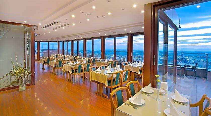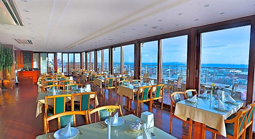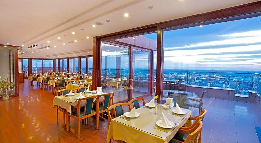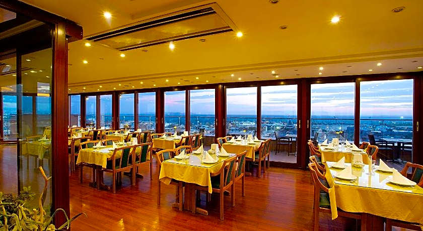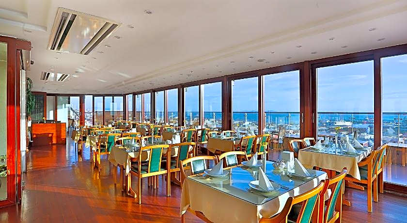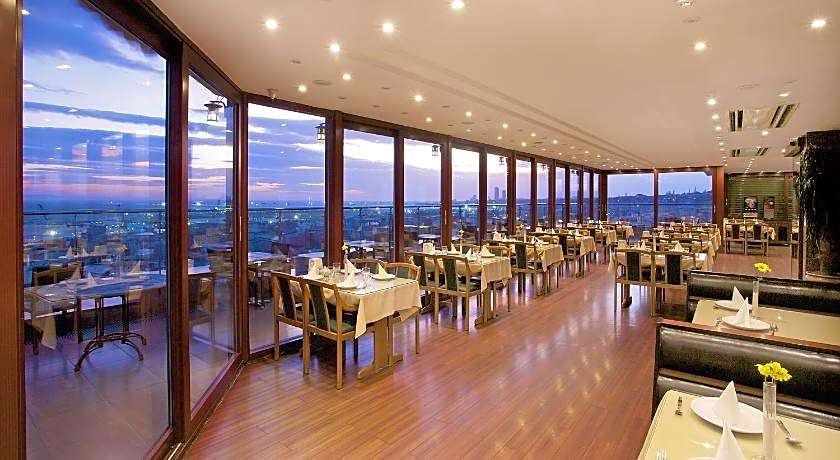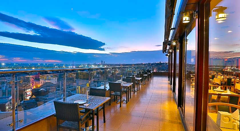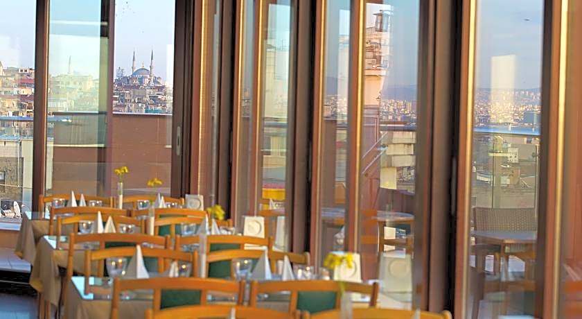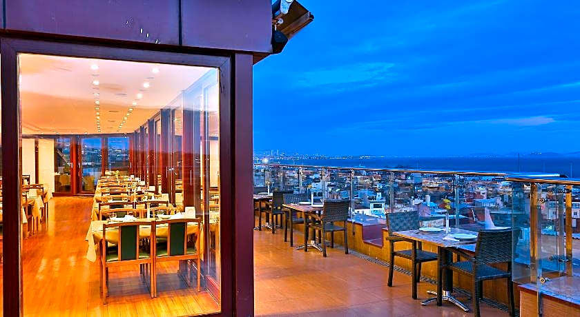 Guests can start their day with a traditional Turkish breakfast buffet served on the rooftop terrace, which provides a scenic setting for morning dining. The hotel also includes a restaurant and café, while room service is available for added comfort.